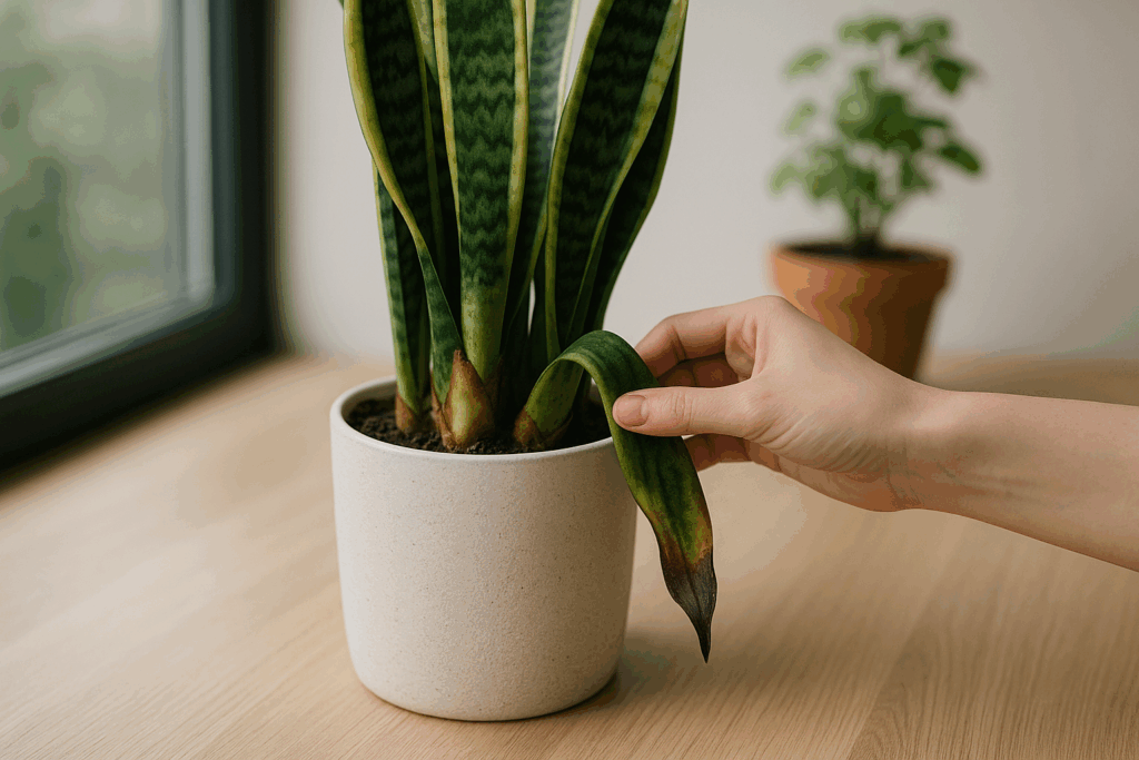 サンスベリアは多肉質の葉に水を蓄える性質があるため、過度な水やりが続くと根が酸欠状態になり、腐敗が始まります。この状態では、葉の根元が柔らかくなり、持ち上げると株ごと倒れてしまうケースも珍しくありません。 - 水分不足による萎れ
