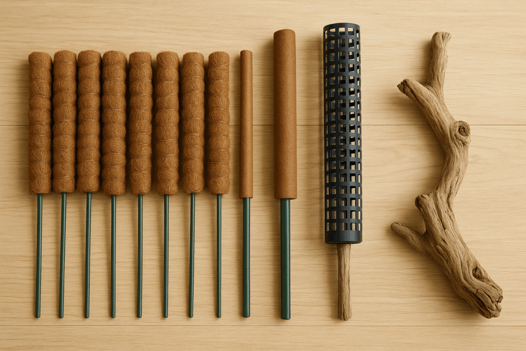 広がりが強く、株全体を支えたい場合は、太めのヘゴ棒やココスティックを中心に据えるのが効果的です。