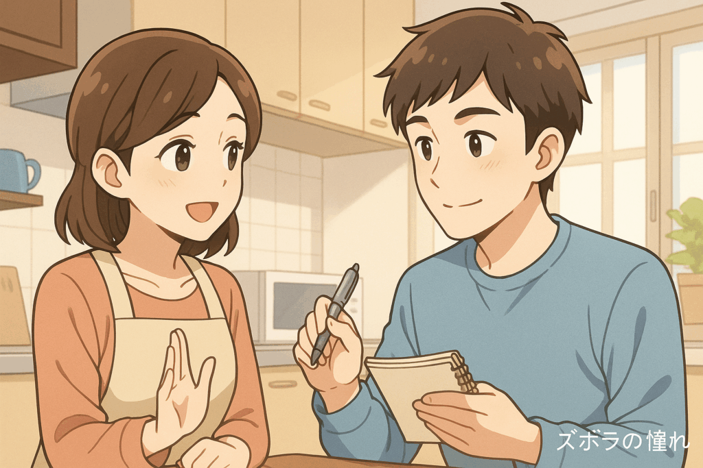 こうやって「結果が目に見える形」にすると、旦那さんも達成感を得やすいですし、あなたも「またやり直し…」というストレスが減ります。内容は旦那さんの気質に合わせて変更してみてくださいね。