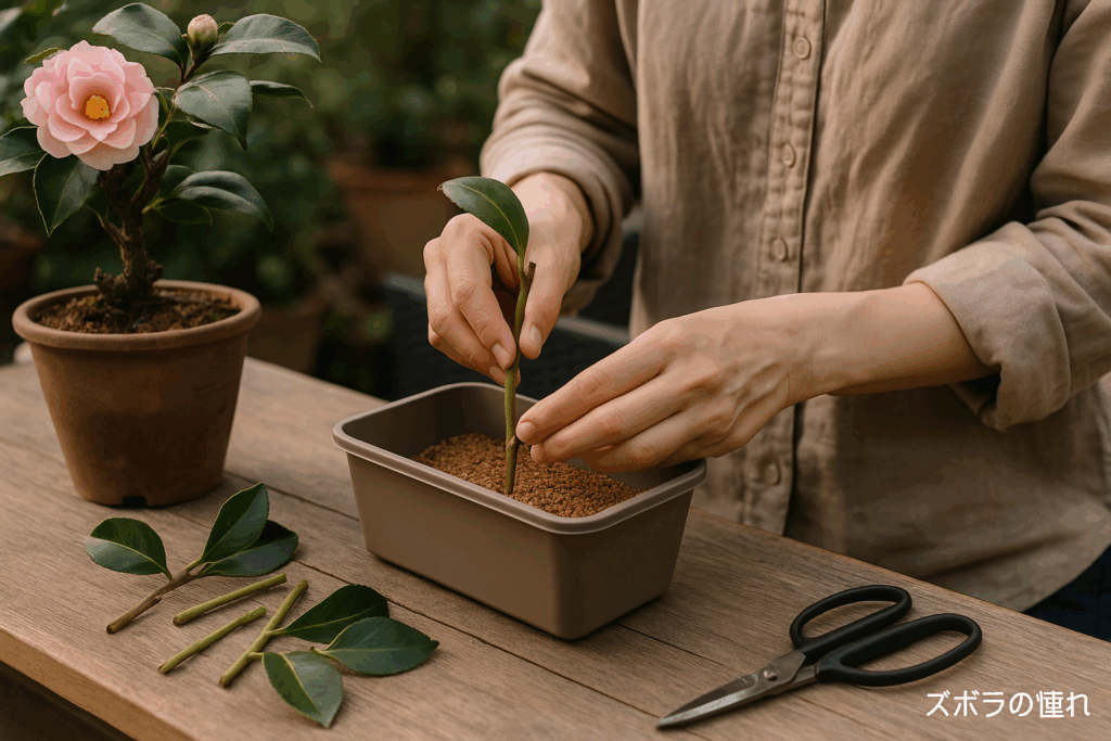 半硬化枝(今年伸びてやや固まった枝)を選び、節の下で斜めにカット。下葉を2〜3枚外して蒸散を減らし、切り口は清潔な刃でスパッと。差し床は鹿沼土細粒やパーライト単用が扱いやすく、殺菌の意味で一度熱湯を回しかけておくと安心です。
