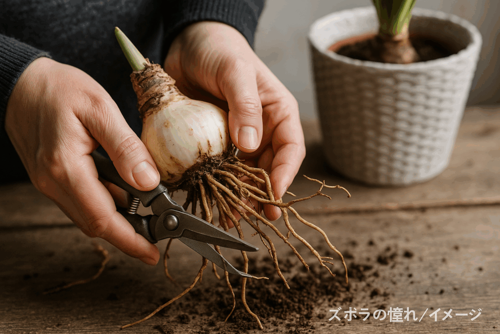 アマリリスの根は球根を支え、水分や養分を吸い上げる役割を持っているため、むやみに切りすぎないようにしてください。