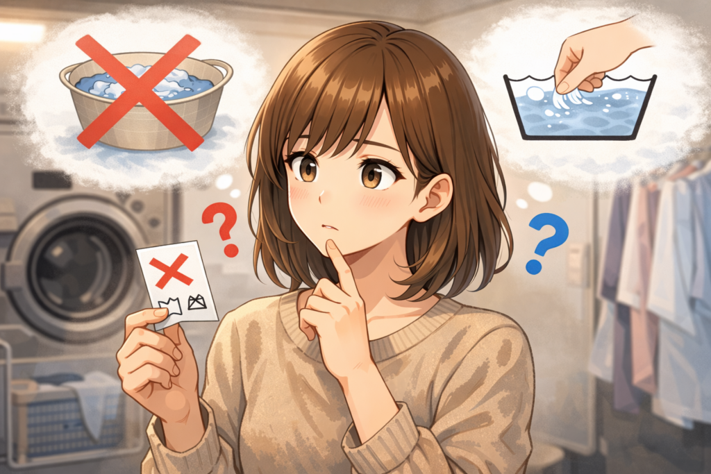 注意:表示に水洗い禁止がある服を家で洗うのはリスクが高いです。正確な情報は各メーカーやブランドの公式案内をご確認ください。