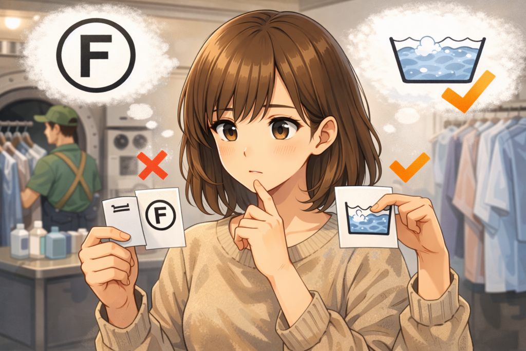 結論から言うと、洗濯表示Fがある服は原則として慎重です。タグに桶マークがなくて、水洗い禁止っぽい表示(×など)があるなら、家洗いはおすすめしません。逆に、桶マークで「手洗いOK」や「非常に弱い洗濯OK」が付いているなら、表示どおりの条件で家で洗える可能性があります。