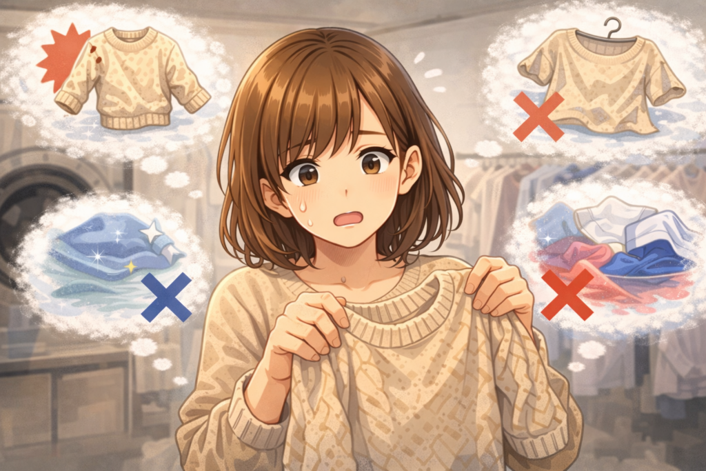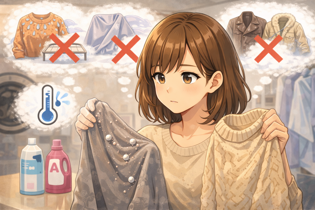 同じ「ニット」に見えても、中身がウールなのかポリエステル混なのかで難易度が変わります。素材で迷うときは、アクリルとポリエステルの洗濯しやすさ比較も参考にどうぞ。