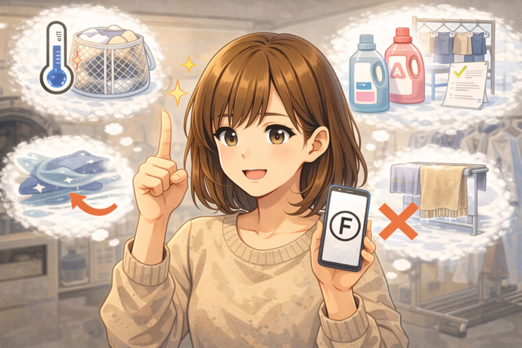 ここでは、洗濯表示Fの「そもそも何?」をズボラ向けに整理します。判断を間違えると縮みや型崩れにつながるので、最初にチェックポイントだけ覚えておくのがラクですよ。