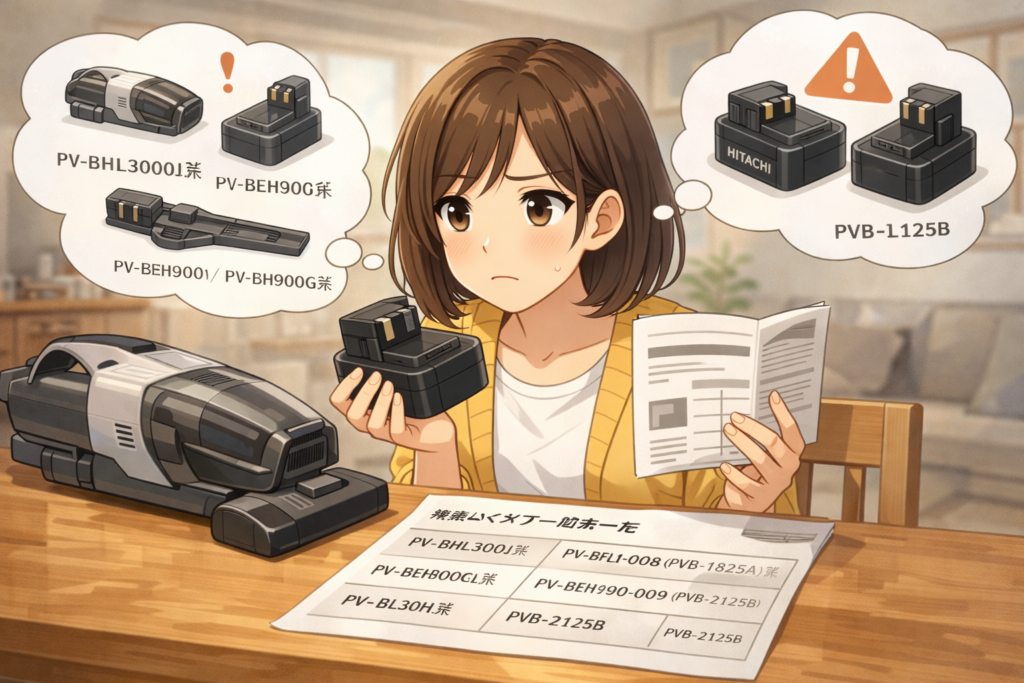 ここがズボラ最大の落とし穴で「同じ日立の掃除機でもバッテリー型番が違う」問題です。ざっくり代表例をまとめますが、購入前には必ず取扱説明書や本体の型番表示で照合してください。
