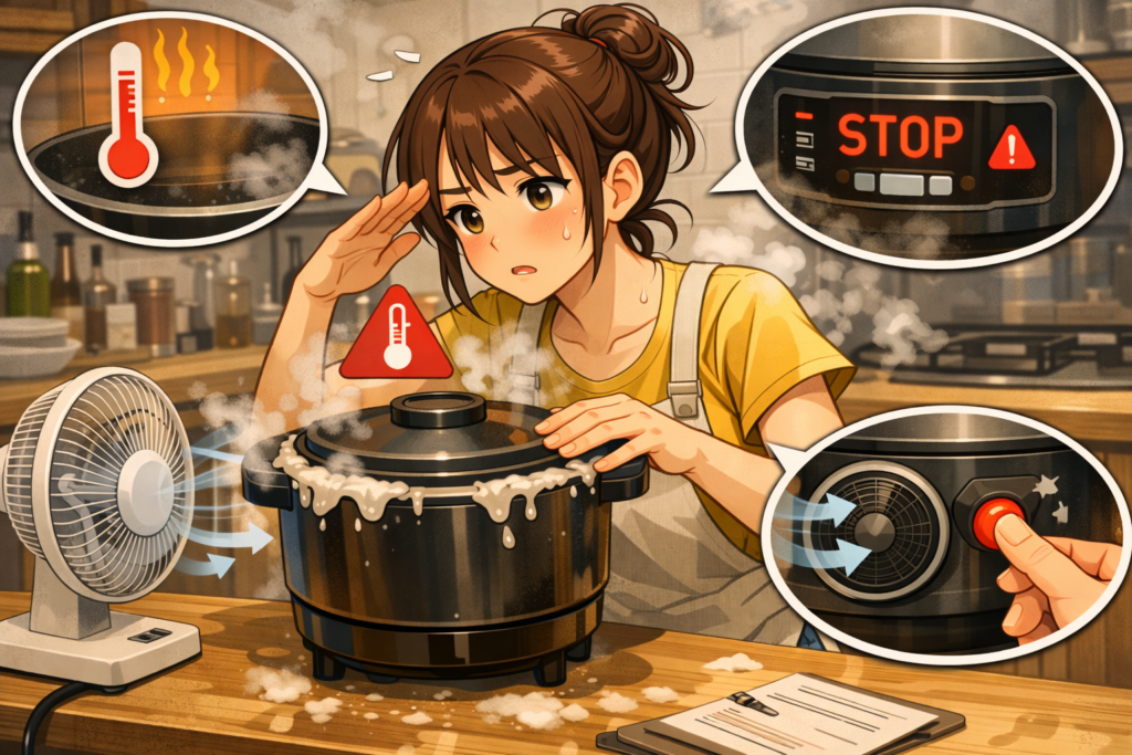 保護機能で停止した場合は、電源をオフにしてしばらく時間を置き、本体が十分に冷えるまで待ちましょう。ファンが回っている間に再度フタを閉め直し、内容を混ぜてから再セットすると再開しやすくなります。落ち着いて休ませることで安全装置が解除されるケースが多いです。