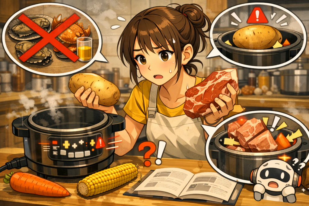 停止の原因に心当たりがある場合は、材料の量や水分量を見直します。具材を減らしてMaxライン以下にする、水を少し足す、水分多めで煮込み直すなどの対策をしてみてください。また、とろみが強いメニューでは水分を多めにすることで停止を防げます。