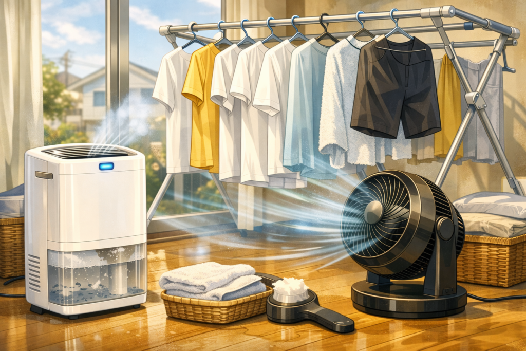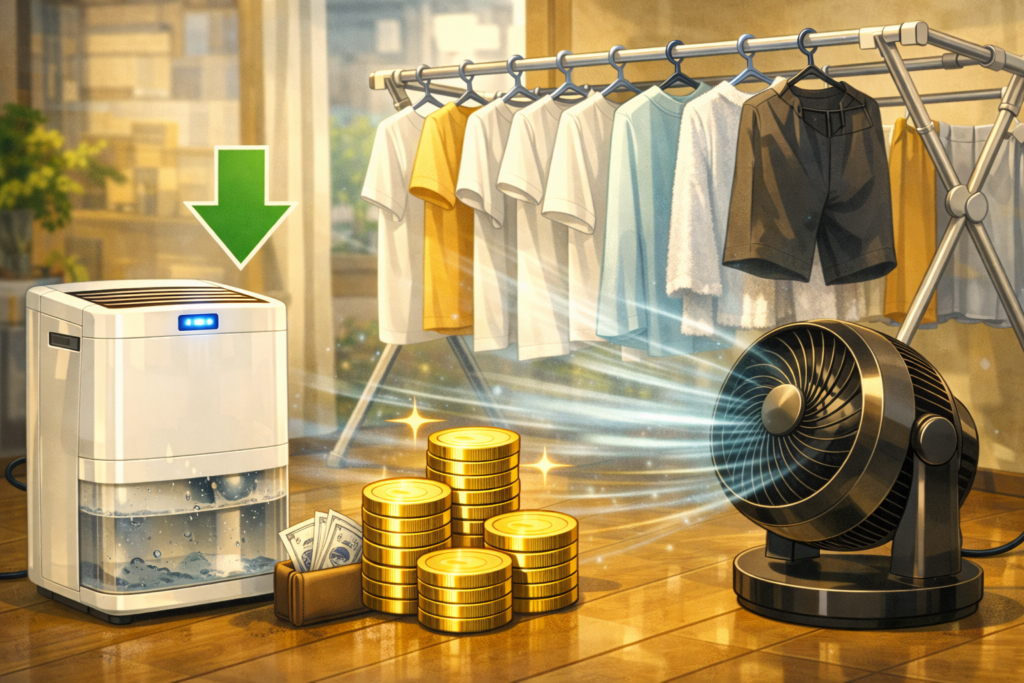 • 電気代を最優先するなら:除湿機+サーキュレーター