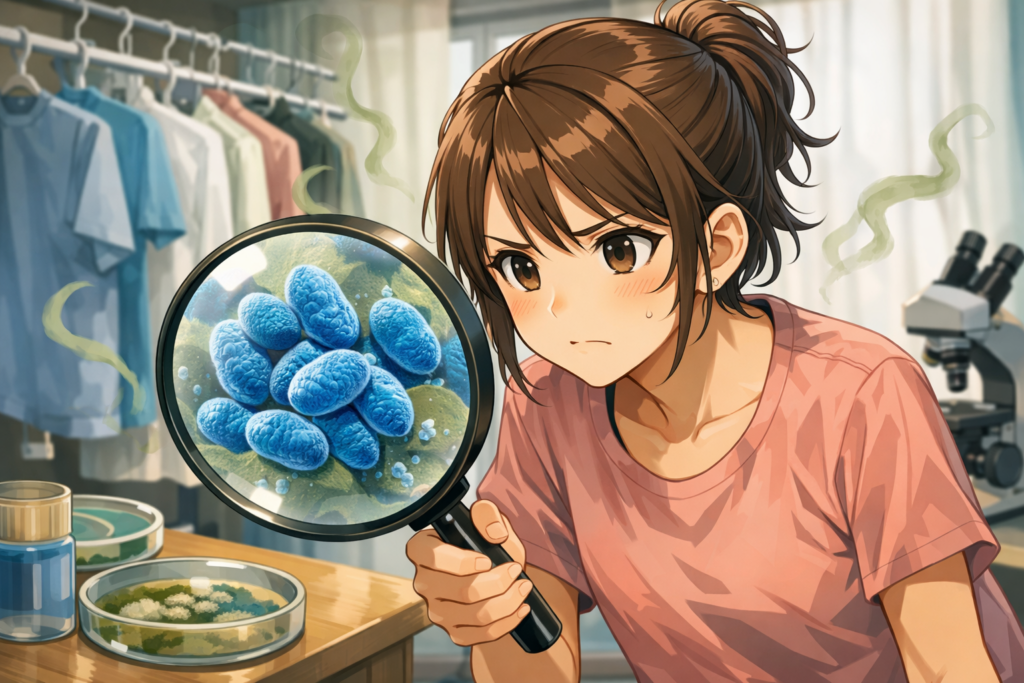 部屋干し臭の代表格は、洗濯物に残った汚れをエサにして増えやすい菌が関係していることが多いです。よく言われるのがモラクセラ菌。菌そのものが強烈に臭いというより、湿った状態で汚れ(皮脂・たんぱく汚れ)を分解したときの代謝物が、生乾き臭っぽいニオイにつながりやすいんですよね。