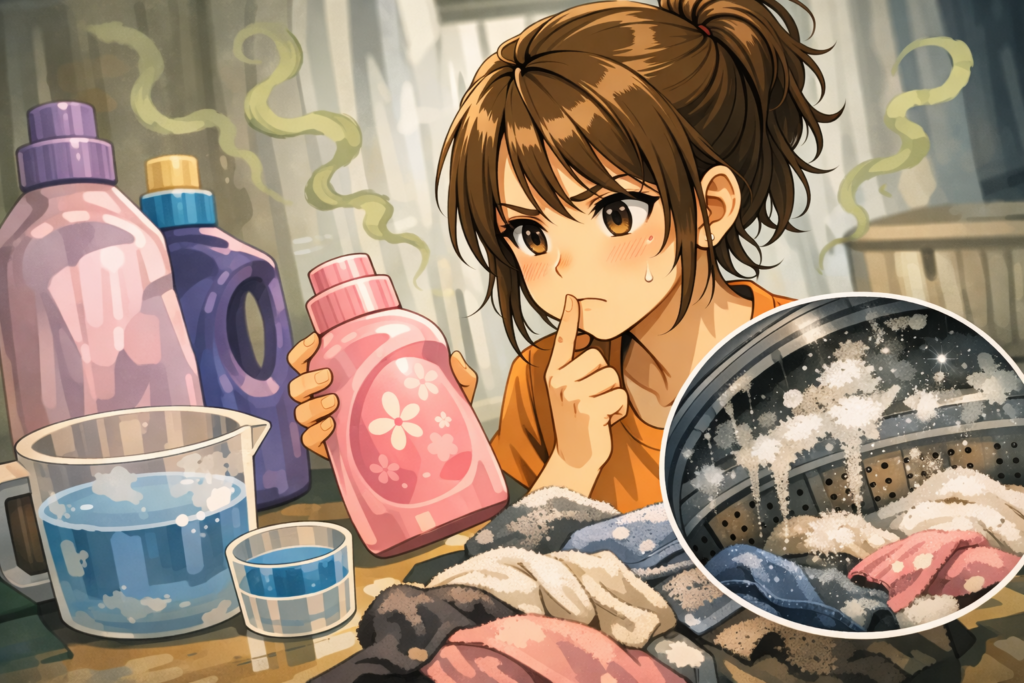 香りでごまかしたくなるけど、柔軟剤の使いすぎはニオイの悪化につながることもあります。理由はシンプルで、繊維表面に成分が残りやすくなったり、膜っぽくなって乾きにくくなったりすることがあるから。