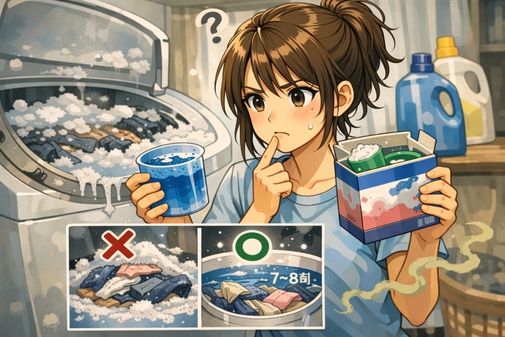 洗剤を多めに入れて解決しようとすると、すすぎ残しが増えて逆効果になることがあります。使う量は表示を優先してください。