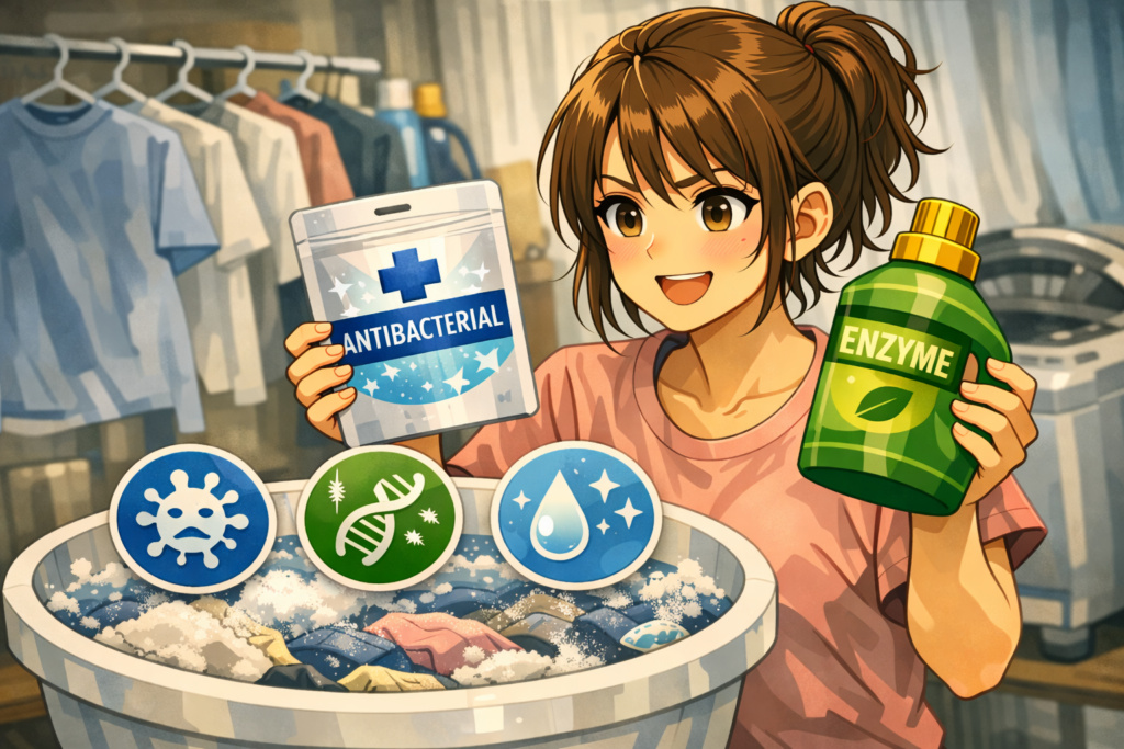 予防で頼れるのは、いわゆる部屋干し用洗剤や「抗菌」「消臭」をうたうタイプ。ズボラ的に重要なのは、洗い方を変えずに底上げできるところです。