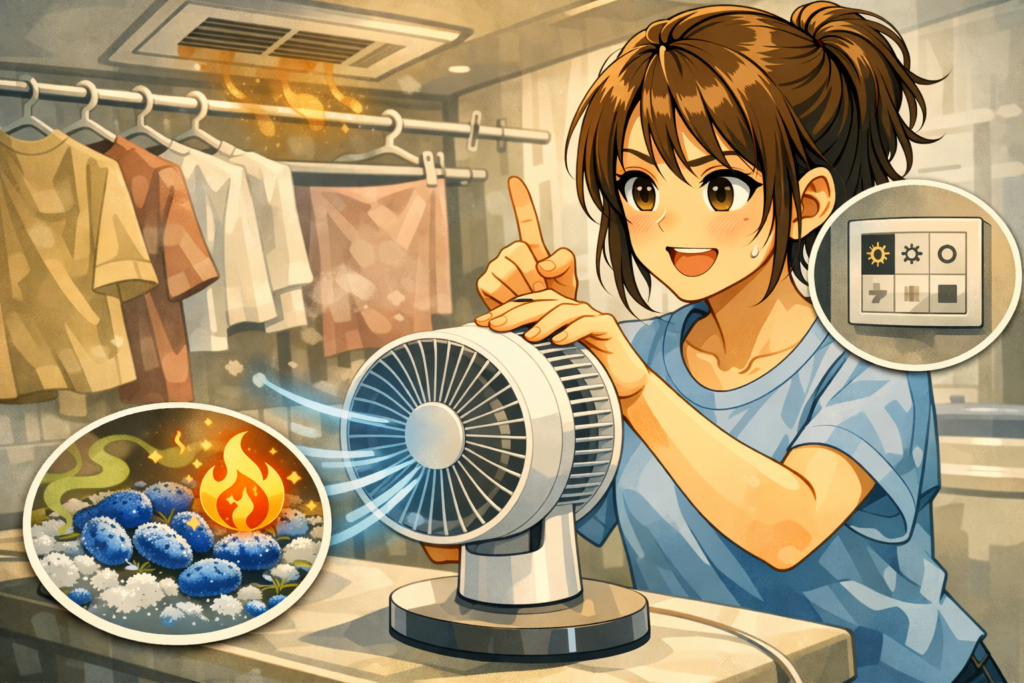 まずやるのは「早く乾かす」。サーキュレーターや浴室乾燥で乾燥時間を短くするだけでも、体感が変わりやすいです。