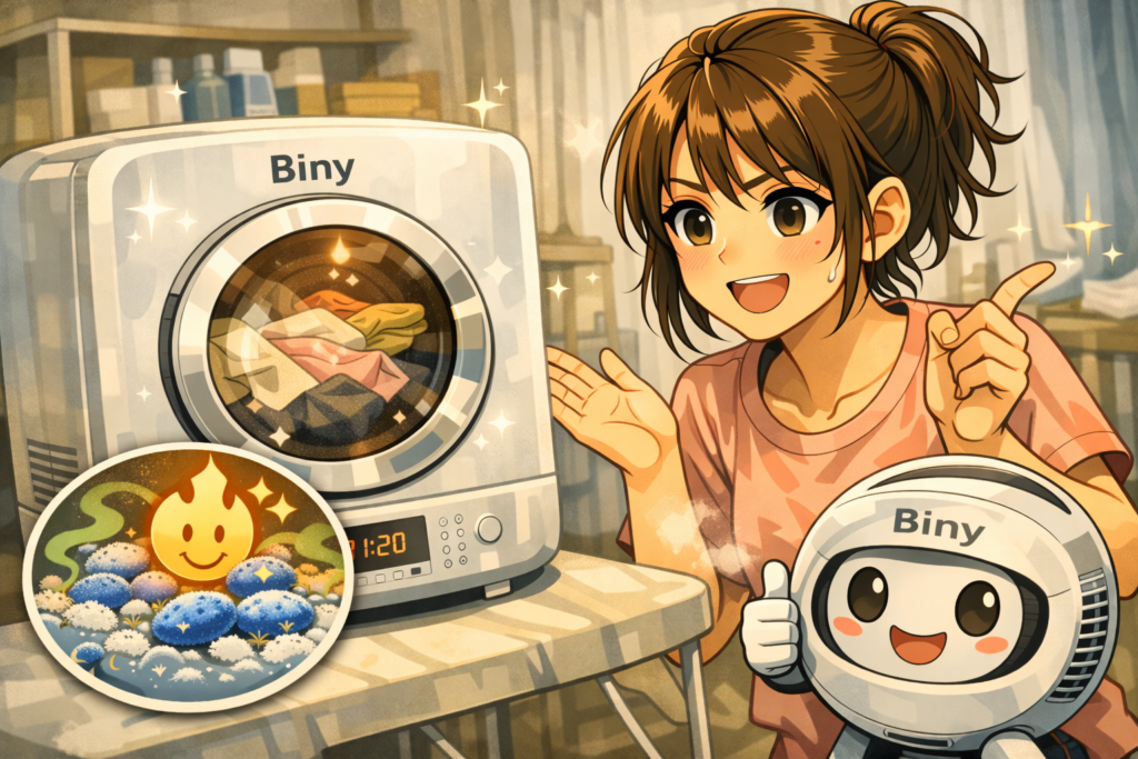 部屋干し臭のストレスを根本から減らしたい方は、乾燥グッズとしてBinyの衣類乾燥機を一度チェックしてみるのもアリだと思います。