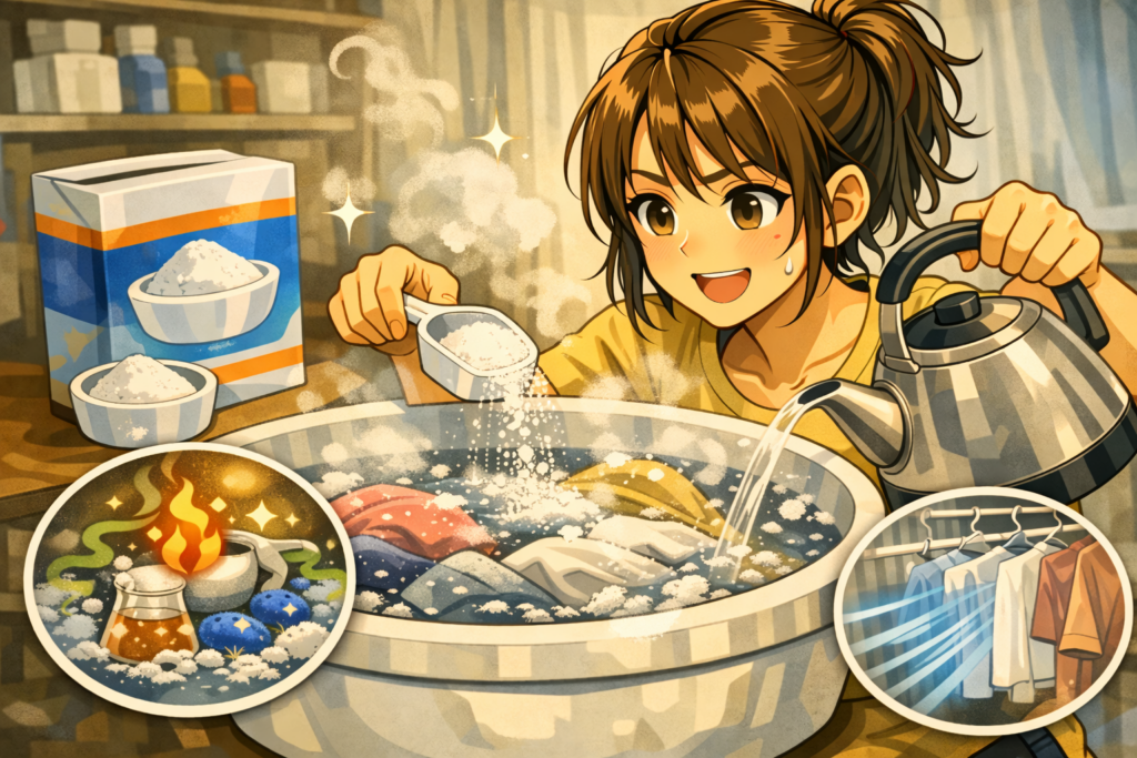 重曹は弱アルカリ性で、皮脂汚れを落としやすくするサポート役。やり方は「ぬるま湯に溶かしてしばらくつける→通常洗い」。ただし、洗濯機や素材との相性もあるので、使えるかどうかは洗濯表示や機種の注意事項を確認してください。