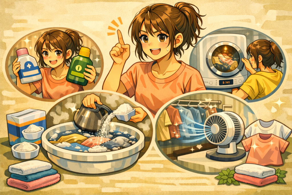 それでも残るときは「酸素系漂白剤のつけ置き」や「乾燥機・コインランドリー」でリセット。