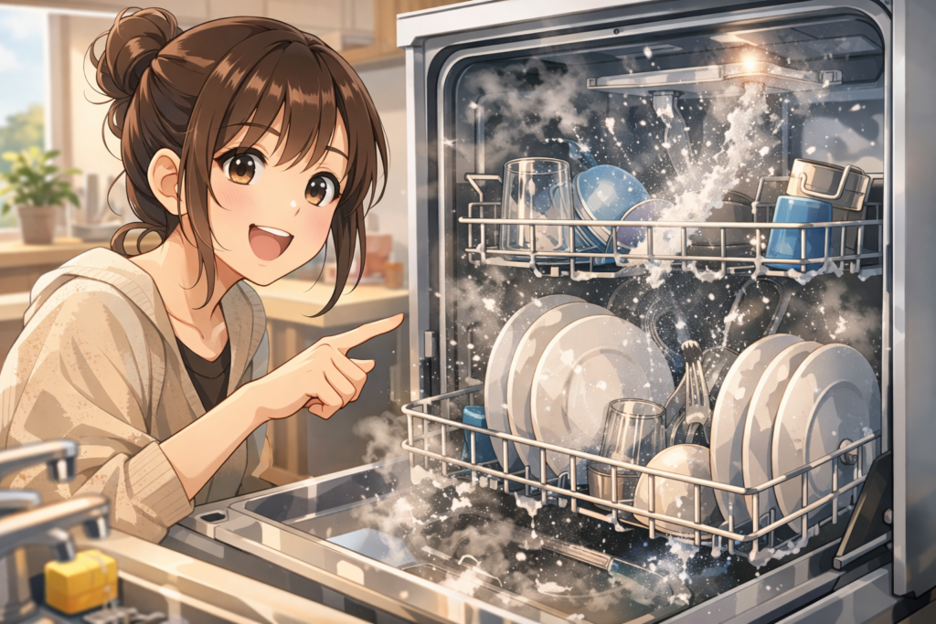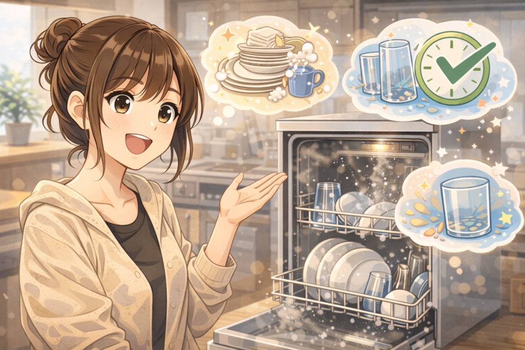 そして何より大きいのは、「皿洗いしなきゃ…」という精神的な重圧から解放されることです。食後にスイッチ一つ入れれば後は機械任せ。自分は他の家事をしたり、少し休憩したりできます。「家事を同時進行できる」という意味でも、食洗機は忙しい人にとって強力な時短ツールなんです。