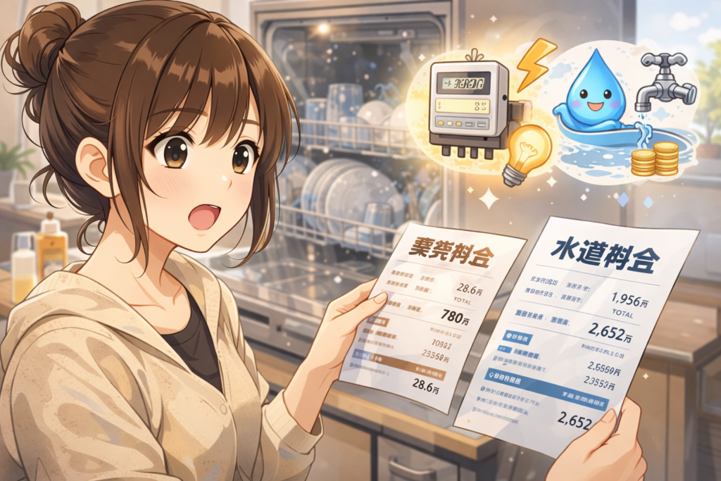 我が家でも食洗機導入後に水道光熱費をチェックしましたが、「手洗いの方がお金がかかっていたかも…」と感じました。節水効果で水道代が減り、お湯を沸かす頻度も減ったことでガス代も微減。電気代の増加分は十分カバーできています。もちろん機種や使い方によって差はありますが、少なくとも「電気代がもったいないから使わない」という心配はあまり要らないと実感しています。