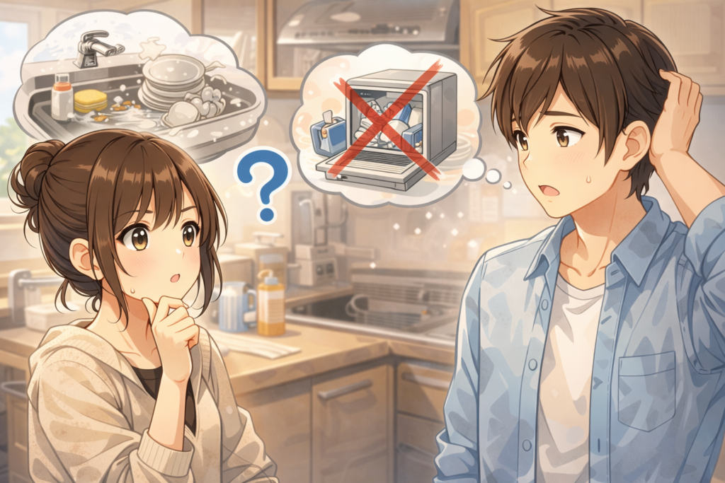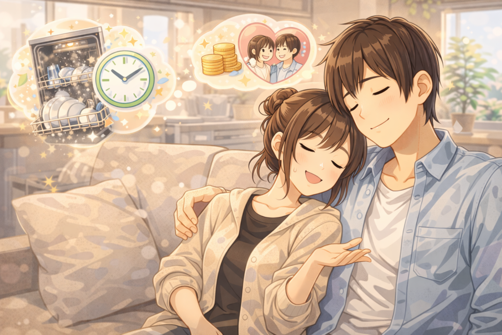 また、夫婦間の家事分担の面でも食洗機は救世主でした。我が家では以前、皿洗いの押し付け合いで険悪になることも…。でも今は「食洗機を回すだけ」なので、どちらがやっても大差なく、喧嘩になることがありません。むしろ「今日は私がセットしとくね!」と声を掛け合う余裕も生まれました。実際、家事のダブルチェック(やり直し)が減るのも利点です。食洗機は洗い残しによる“二度手間”を無くしてくれるので、パートナーの洗い残しを後から発見してイライラ…なんてことも起きにくくなります。