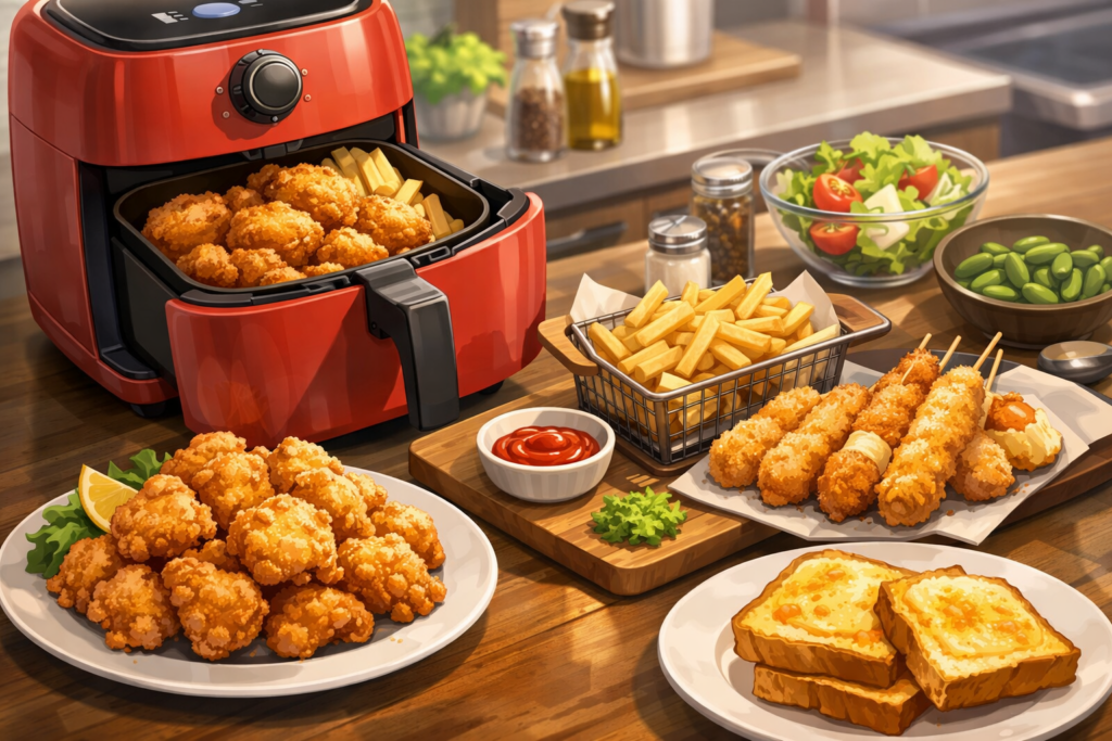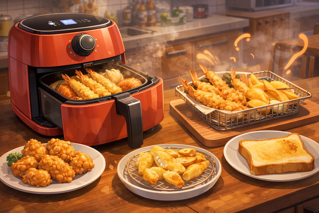 エアオーブンの強みは、ズバリ揚げ物っぽい仕上がりを、油ほぼナシで作れるところ。から揚げ、ポテト、コロッケみたいな「ザ・おかず」を、揚げ鍋を出さずに済ませられるのが最高です。