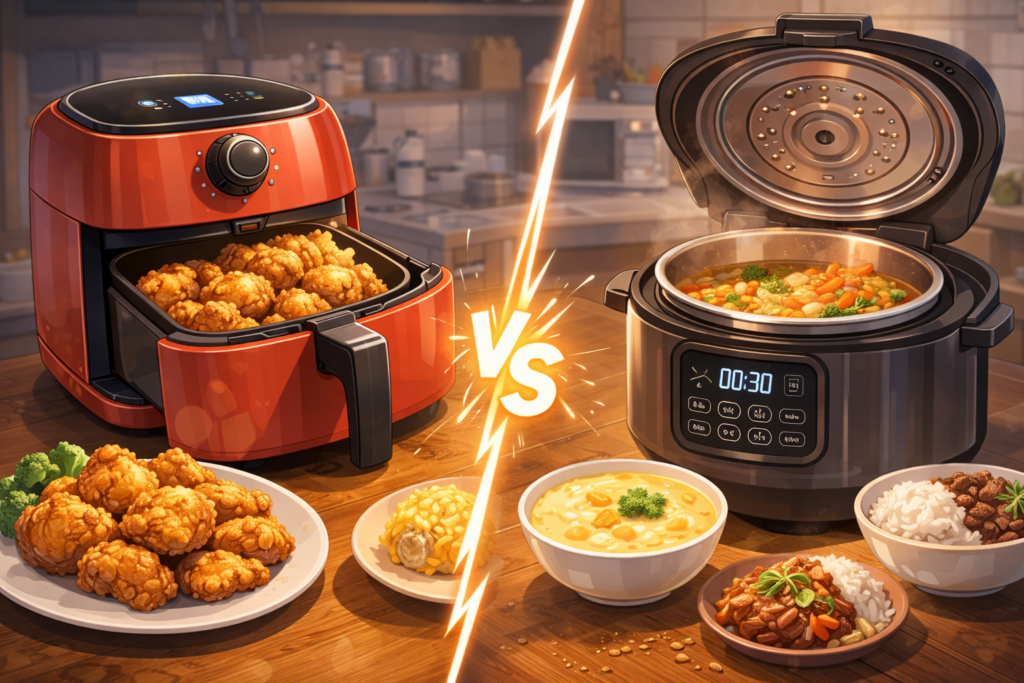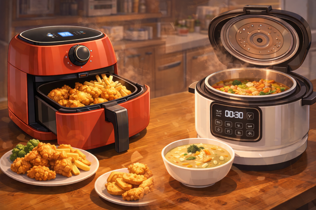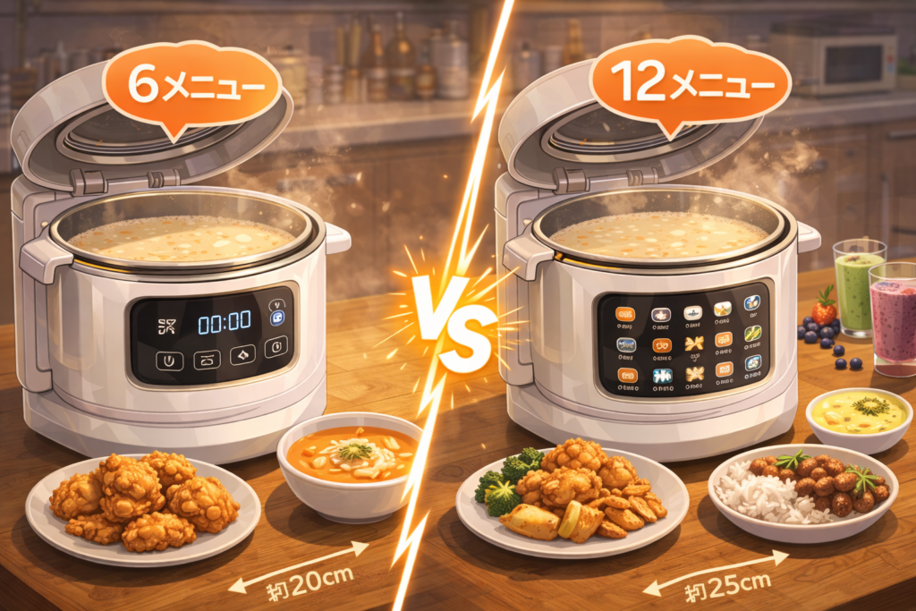 この2つ、見た目はコンパクトで似てるのに、できることがけっこう違います。揚げ物レシピや温め直し、冷凍食品やトーストがラクになるのはどっち?スープ作り方が簡単で、豆乳やスムージーまで作れるのは?口コミやデメリット、壊れやすいのか、洗い方は面倒じゃないか、食洗機は使えるのか…サイズや容量、メニュー数、マルチクッカー比較まで気になるポイントをまとめて整理します。