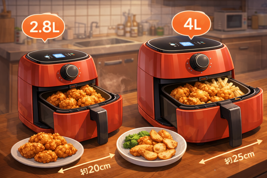 容量は「何人分を一回で作りたいか」で体感が変わります。2人分ならちょうどよくても、家族分の揚げ物をまとめて作りたいと回転数が増えがち。一度に全部やらないとストレスなタイプかどうかで判断すると良いです。