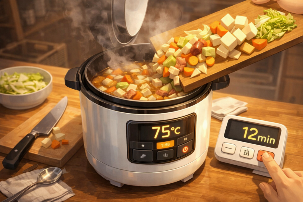 電気代を抑える視点なら、加熱時間が伸びないように「火の通りやすい切り方」にしておくのがコツです。大根やにんじんは薄めのいちょう切り、こんにゃくは下処理済みを使う、きのこは手で割く。豚肉は少量でOK。脂のうまみが出れば、満足感はちゃんと作れます。