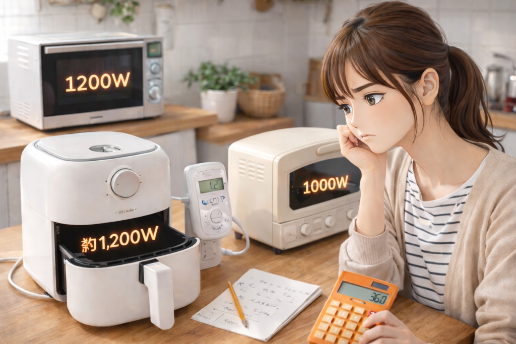 この表は「1時間あたり」なので、実際はここから「何分使うか」で割り戻す感じです。エアオーブンは短時間で仕上がることが多いので、電気代の体感はもっと軽い人が多いと思います。