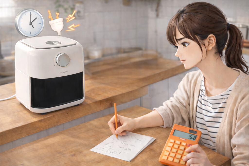 ノンフライヤーの電気代比較をするときは、「1時間あたり」だけで比べるとミスりやすいです。実際は10〜20分で終わることが多いので、1回あたり(調理時間あたり)で比べる方がリアル。