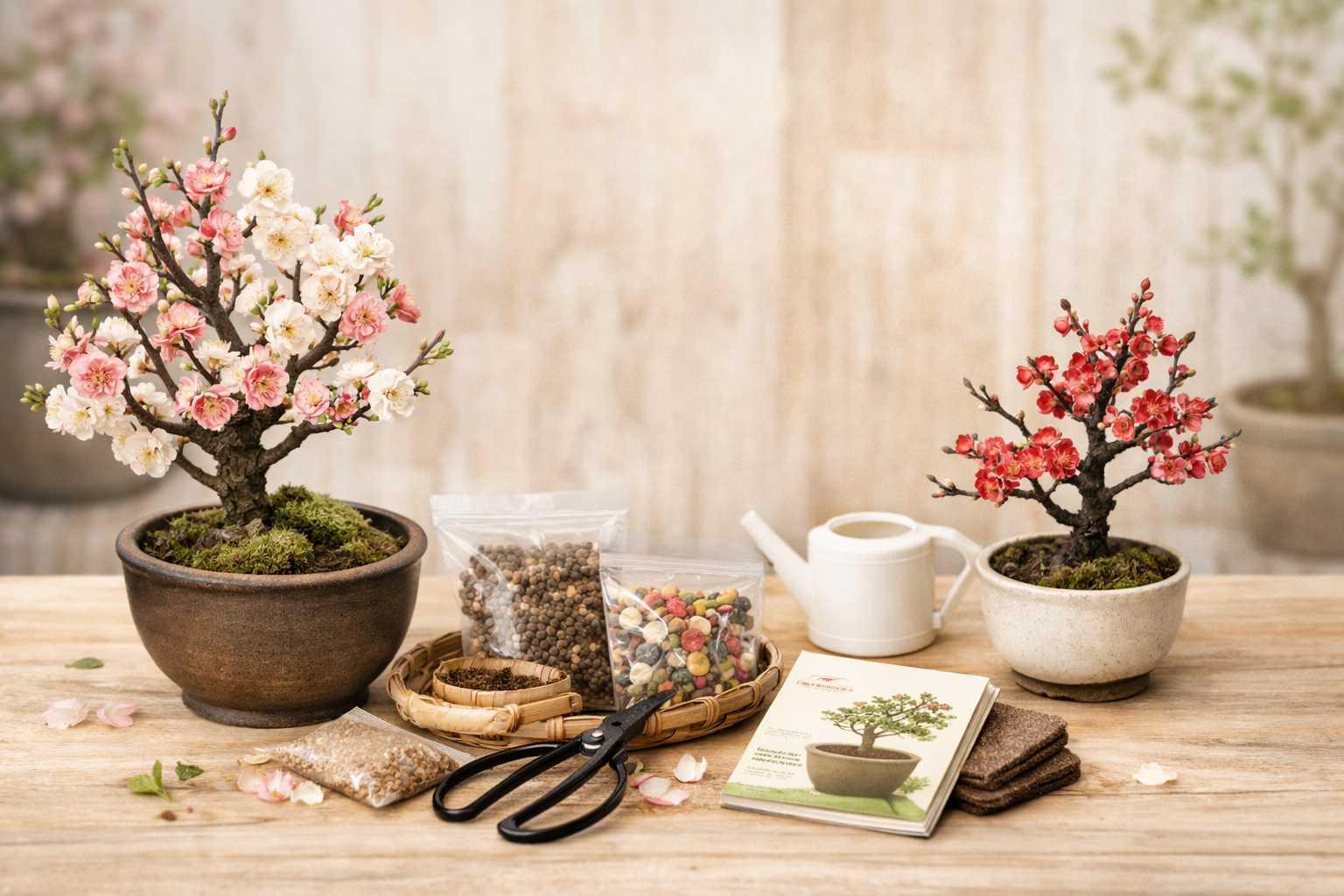 梅の鉢植え初心者は、「キットがあるかどうか」より、必要なものを最初に整理して、目的に合う苗を選ぶことが大切です。実際の流通も、完成キットより単品苗や受粉樹セットが中心です。
