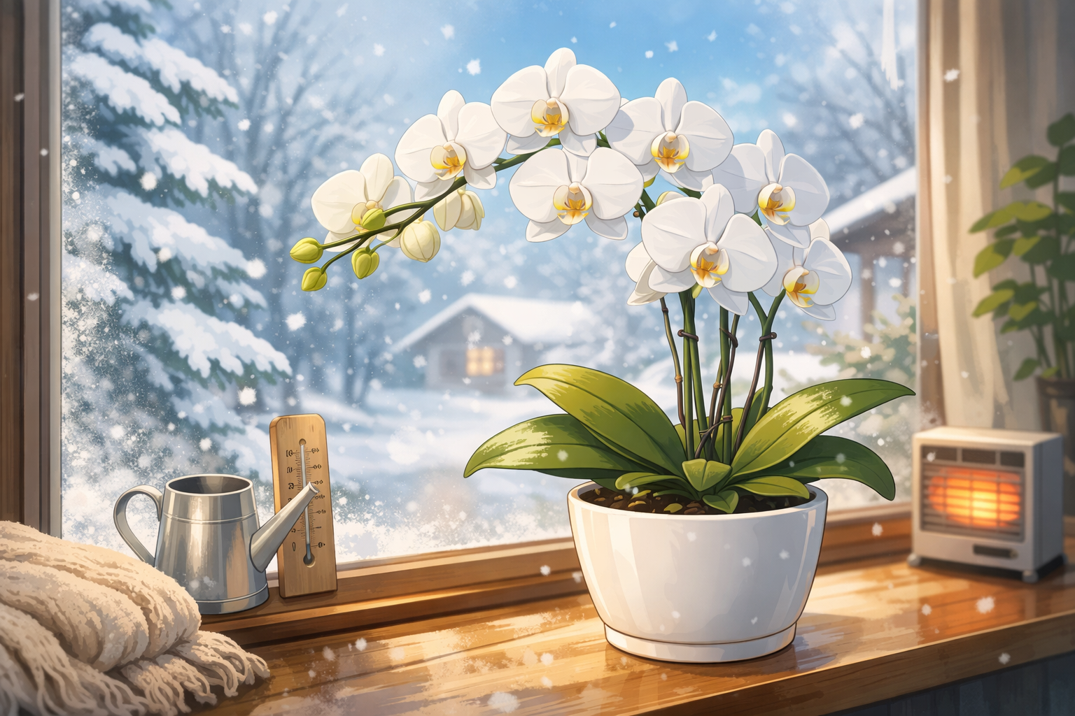 胡蝶蘭の冬管理は、完璧に世話をすることより、余計なことをしすぎないことが成功の近道です。最低限の暖かさを保つ、夜の冷え込みを避ける、冬の水やりは控えめにする、乾燥しすぎるなら湿度を少し補う。この基本だけでも、かなり違います。