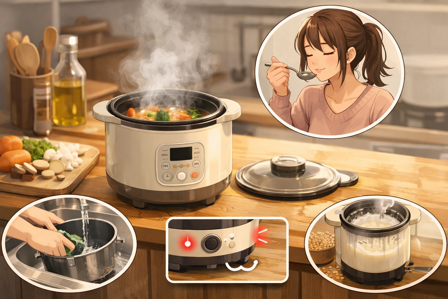 私なら、まずは失敗しにくいポタージュ、おかゆ、豆乳あたりから始めます。ここで使用感がつかめると、忙しい日の自炊がかなりラクになりますよ。